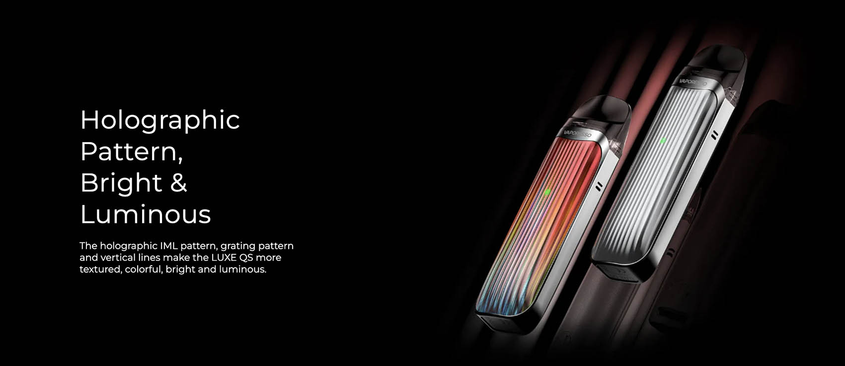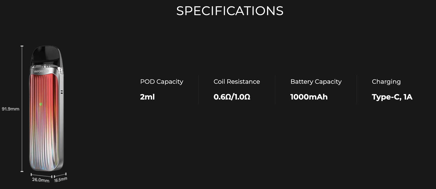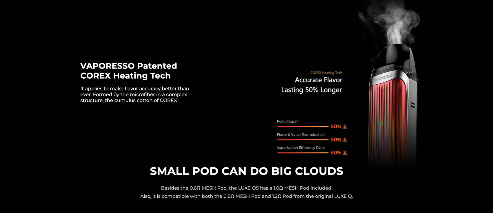 The most compact pod system that supports real RDTL vaping with 0.6Ω MESH Pod. It’s one of the smallest, and also one of the strongest pod systems by far. That’s why it’s named LUXE QS which means CUTE BUT STRONG, cute size and design, strong taste and vapor. VAPORESSO Patented COREX Heating Tech applies to make flavor accuracy better than ever. Formed by the microfiber in a complex structure, the cumulus cotton of COREX. Besides the 0.6Ω MESH Pod, the LUXE QS has a 1.0Ω MESH Pod included.