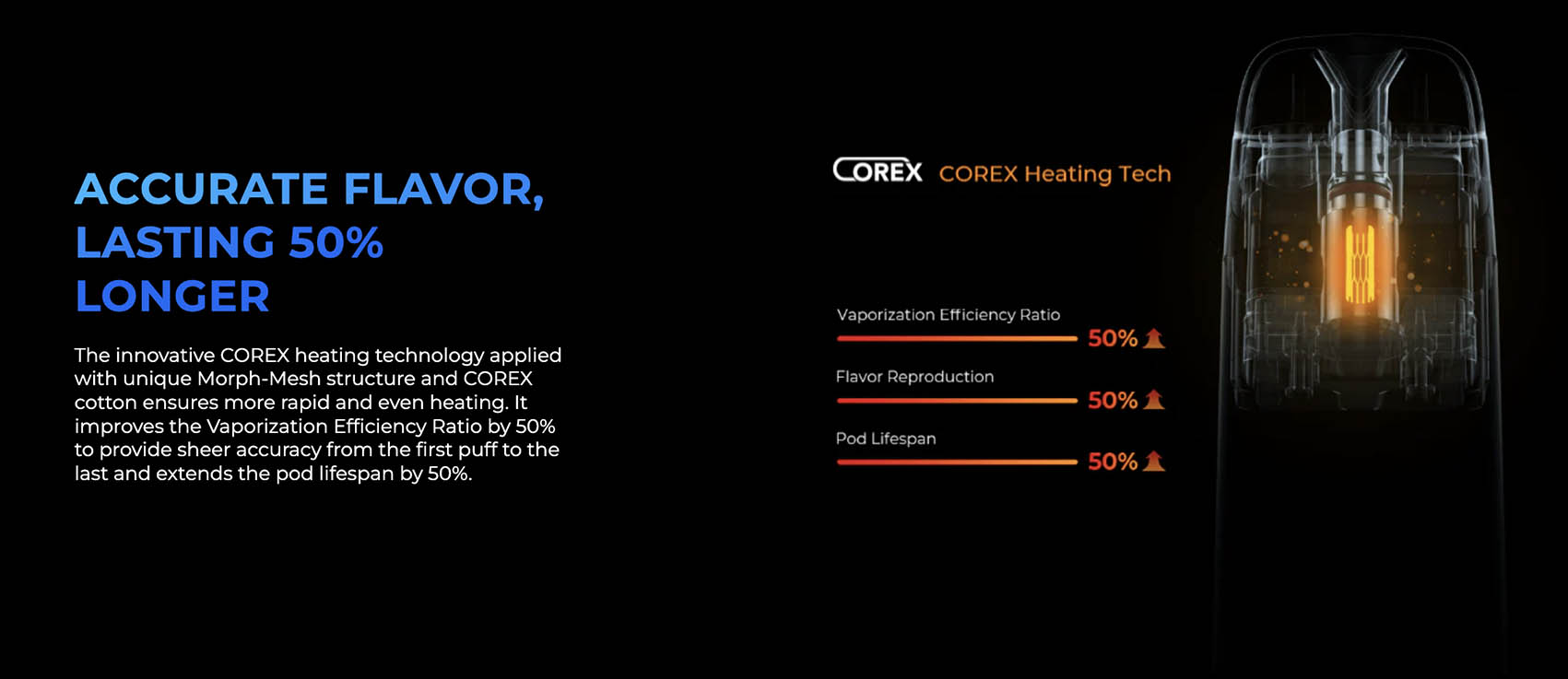 The innovative COREX heating technology applied with unique Morph-Mesh structure and COREX cotton ensures more rapid and even heating. It improves the Vaporization Efficiency Ratio by 50% to provide sheer flavor accuracy from the first puff to the last and extends the pod lifespan by 50%.
